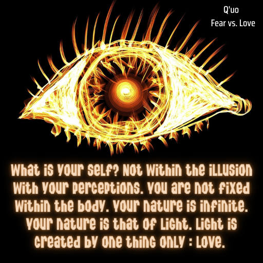 This eternal outlook is crucial to gaining a well balanced experience here. Q’uo does such a great job of pointing out the flaws in identifying with the body/self. ‘What is your self?’, they ask us to ponder… They make it a point to differentiate here, too – they say ‘the self – NOT within the illusion.’ They remind us, we are not fixed within the body with these perceptions. We are beings of light/love. We are made of light and light is created by just one thing; love.
