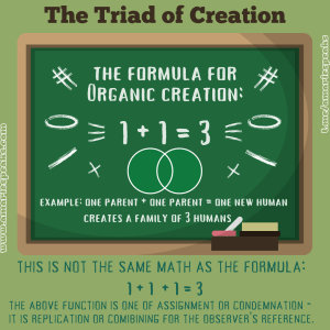 No, no – this isn’t that 1984 propaganda 2+2=5 nonsense – what I’m referring to is this triad of organic creation. Triality, the two opposite ones joining to form a new solution which is birthed forth only through contribution from both sides.