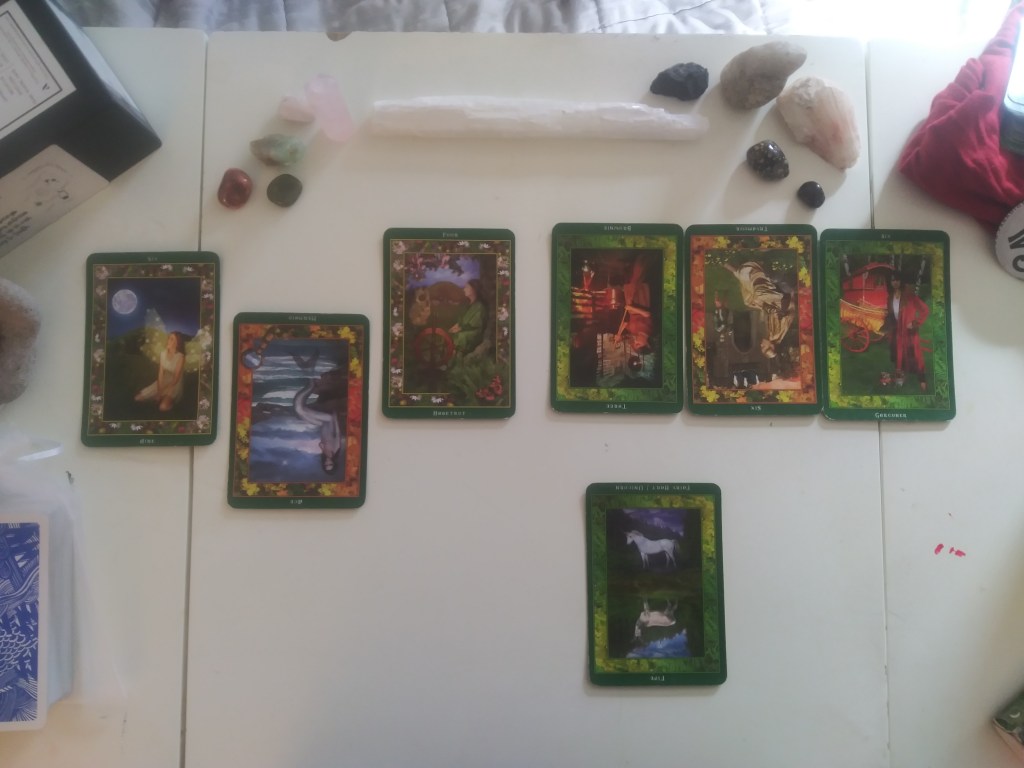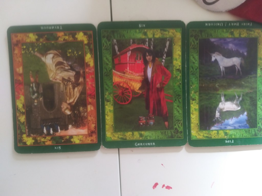 From the response of my Aquarian deck I got a strong message of connection to community and the gratifying roles we can fulfill in social settings. It’s clear they want to amplify the themes around how others see us and the issues it can cause within communal settings. The reversed Star and the seven of swords can relate and resonate a lot with the messages from the fairies Tryamour, the reverse mermaid and brownie – as well as that heavy warning with Garconer. The seven of swords has an underlying air of mastery and learned knowledge through trial and error, so it’s no surprise again to see the Star reversed as well, because it is hard to stay true to your heart when you’re facing external pressures. I think we can find our way back to more connected, healthy and honest traditions eventually!