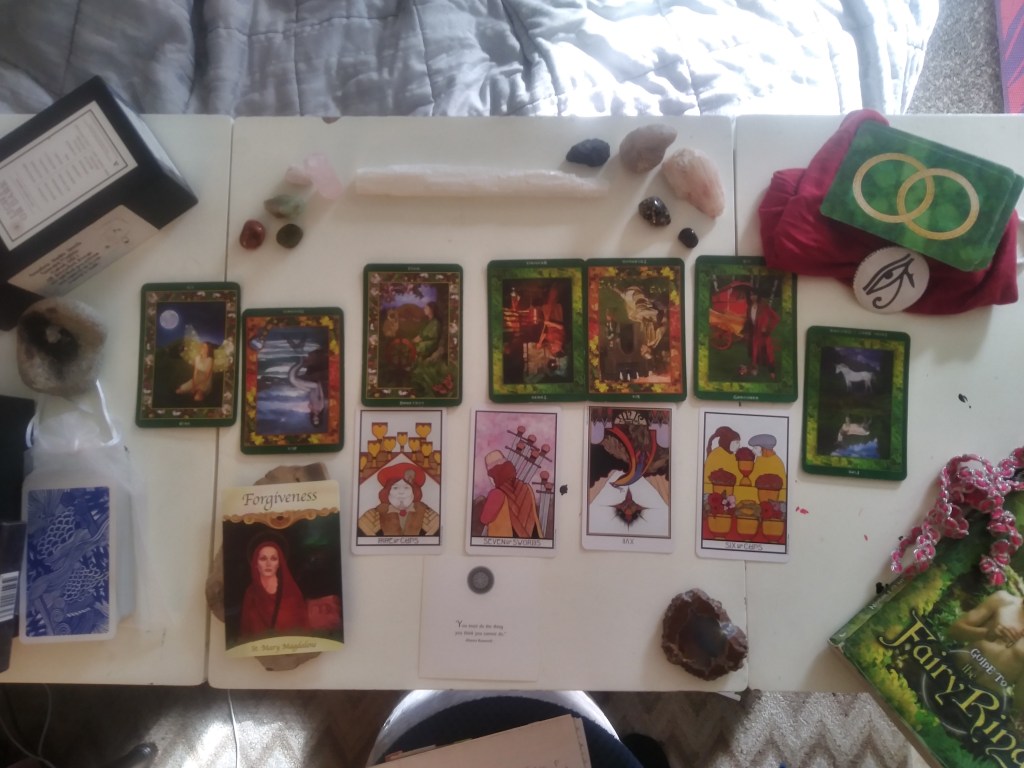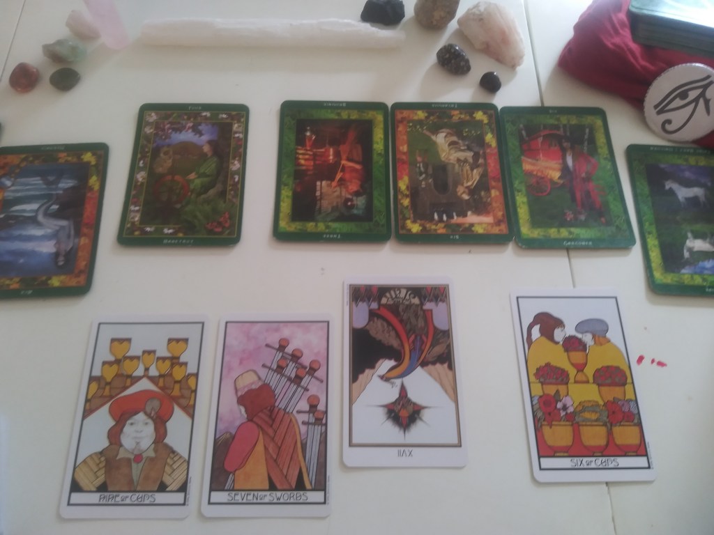I thought I’d try something new with my bitchute/youtube channels and share the messages from the reading via video on zoom and screen share the pics I took during the reading. I planned to talk through the messages on video while clicking through all the images to show the progression of the reading. I really did not want to record the reading live because I lack the equipment to make a suitable/viewable video that shows the table and cards at a decent angle. I’m going to get there some day soon! But, for today’s message, it’s just not possible, hence this new set up of screen sharing via zoom.